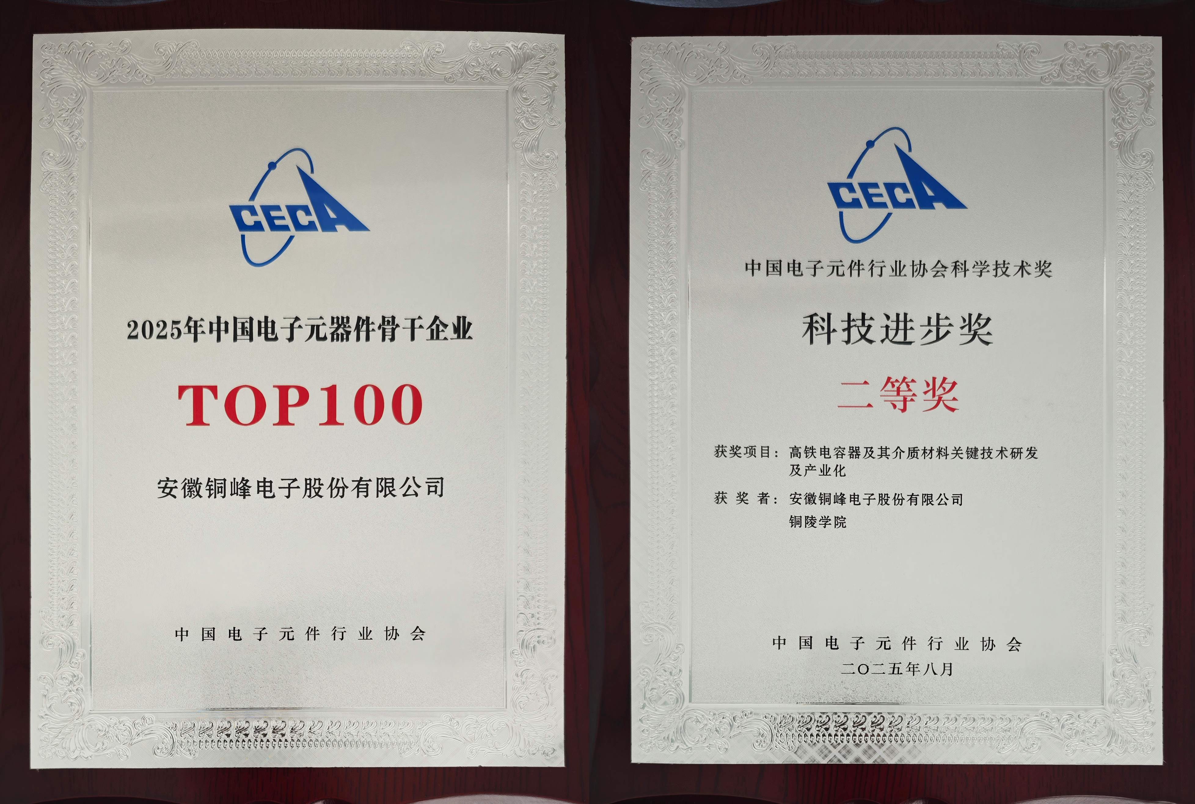 會議過程中,除舉辦主題演講、高端對話、分會平行論壇外,還舉行了2025年中國電子元器件骨干企業(yè)、2025年度(第3屆)中國電子元件行業(yè)協(xié)會科學技術(shù)獎頒獎儀式,公司連續(xù)三十余屆獲評“中國電子元器件骨干行業(yè)TOP100 ”榮譽,并榮獲中電元協(xié)科技進步二等獎。