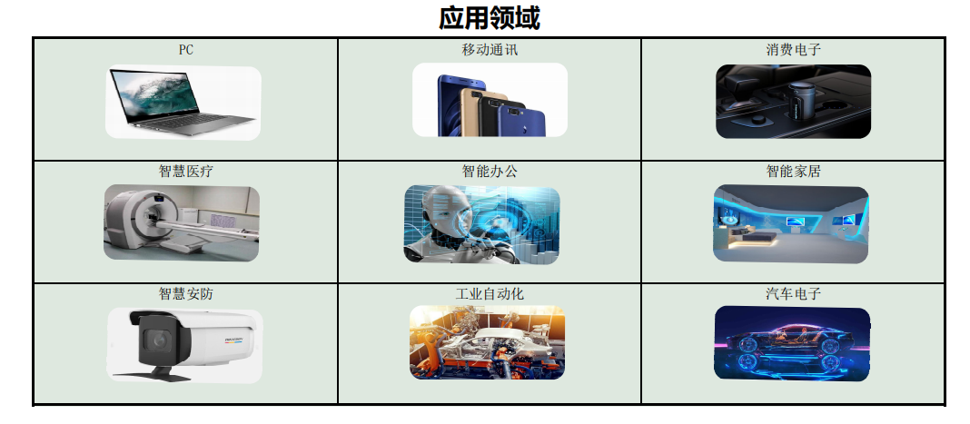 產(chǎn)品廣泛應(yīng)用于:3C(計(jì)算機(jī)、通訊、消費(fèi)電子)、智慧醫(yī)療、智能辦公、智能家居、智慧安防、物聯(lián)網(wǎng)、工業(yè)自動(dòng)化及汽車(chē)電子等領(lǐng)域,靈活滿(mǎn)足全球不同客戶(hù)的差異化需求以及快速創(chuàng)新的追求。